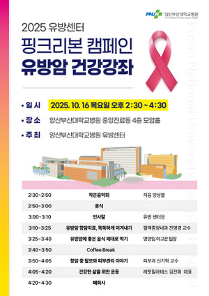 양산부산대병원(병원장 이상돈) 유방센터는 오는 10월 16일(목) 오후 2시 30분, 병원 4층 모암홀에서 ‘2025 핑크리본 캠페인 유방암 건강강좌’를 개최한다.이번 행사는 유방암 환자와 가족은 물론, 유방암 예방과 관리에 관심 있는 시민들에게 유익한 건강 정보를 제공하고 조기 검진의 중요성을 널리 알리기 위해 마련됐다.행사는 ‘지음앙상블과 함께하는 작은 음악회’로 시작된다. 약 20분간 이어지는 이 공연은 환자와 보호자 모두에게 따뜻한 위로와 휴식을 선사할 예정이다. 이어 유방암 치료와 관리에 실질적인 도움이 되는 강좌가 진행된...