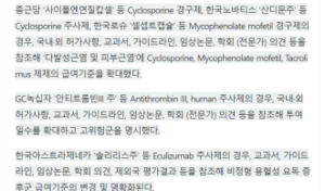 종근당 ‘사이폴엔연질캅셀’ 등 Cyclosporine 경구제, 한국노바티스 ‘산디문주’ 등Cyclosporine 주사제, 한국로슈 '셀셉트캡슐' 등 Mycophenolate mofetil 경구제의 경우, 국내·외 허가사항, 교과서, 가이드라인, 임상논문, 학회 (전문가) 의견 등을 참...