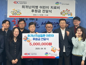 (서울일보/송완식 기자) 한국도로공사 서울경기본부는 희귀난치병으로 투병 중인 지역사회 어린이 5명에게 총 500만 원의 치료비를 후원하며 따뜻한 나눔을 실천했다.이번 후원은 생명나눔 사회공헌활동의 일환으로 치료비 부담을 덜고자 마련됐다. 후원금 전달식은 10일 오전 11시 도공 서울경기본부에서 열렸으며 김재빈 관리처장과 한국어린이난치병협회 윤완채 운영회장을 비롯한 양 기관 관계자들이 참석했다.후원 대상은 협회의 추천을 통해 선정된 희귀난치병을 앓고 있는 어린이 5명으로 △레트증후군(신경 발달 장애), △펠리제우스-메르츠바하병(희귀...