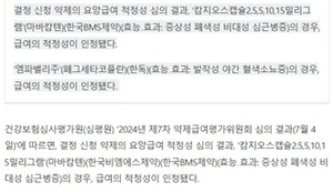 한국bms제약 '캄지오스캡슐2.5,5,10,15밀리그램'·한독 '엠파벨리주' 급여 적정성 인정 '결정 신청 약제의 요양급여 적정성 심의 결과'…'티옥트산·프란루카스트수화물·모사프리드' 급여 적정성 인정