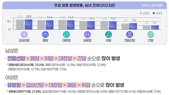 전립선암이 처음으로 우리나라 남성암 발생 1위에 올랐다. 암 통계가 첫 집계된 1999년 이래 1위는 늘 폐암이었다. 보건복지부와 중앙암등록본부(국립 암센터)가 최근 발표한 ‘국가암등록통계’에 따르면 2023년 기준 우리나라 남녀를 통틀어 가장 많이 발생한 암은 갑상선암이었다. 이어 ...