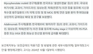 mycophenolate mofetil 경구제(품명: 한국로슈 '셀셉트캡슐' 등) '항 mog 항체 연관 질환 환자 투여대상 성인까지 급여 대상' 확대…adalimumab 주사제(품명: 한국애브비 '휴미라주' 등) 'hurley stage 2 이상이며 hs-pga 중증 또는 ihs4 중증 화농성 한선염 환자에 급여'