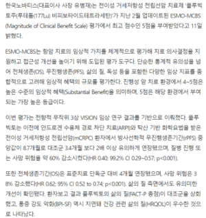한국노바티스(대표이사 사장 유병재)는 전이성 거세저항성 전립선암 치료제 ‘플루빅토주(루테튬(177Lu) 비피보타이드테트라세탄)’가 지난 2월 업데이트된 ESMO-MCBS(Magnitude of Clinical Benefit Scale) 평가에서 최고 점수인 5점을 부여받았다고 11일 ...