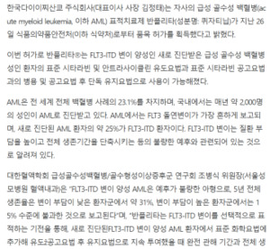 한국다이이찌산쿄 주식회사(대표이사 사장 김정태)는 자사의 급성 골수성 백혈병(acute myeloid leukemia, 이하 AML) 표적치료제 반플리타(성분명: 퀴자티닙)가 지난 26일 식품의약품안전처(이하 식약처)로부터 품목 허가를 획득했다고 밝혔다.이번 허가로 반플리타는 FLT3...