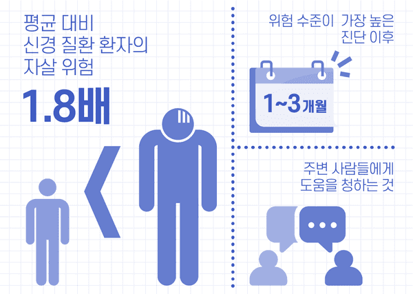 2020년 덴마크에서 진행된 한 연구에 따르면, 신경 질환 환자는 자살 위험이 평균보다 약 1.8배 더 높았는데요. 또한, 진단 이후 1~3개월째에 그 위험 수준이 가장 높으며, 이는 시간이 지날수록 점차 낮아진다는 결과가 나왔습니다.