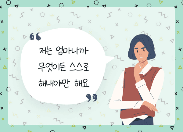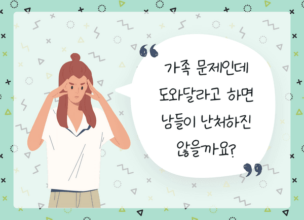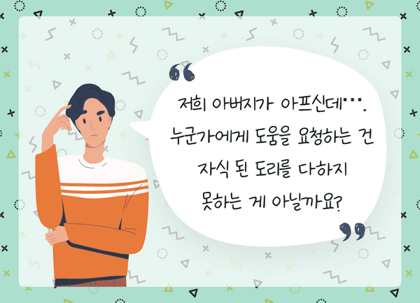 보호자는 ‘누군가 도와줬으면⋯’하고 생각하지만, 적극적으로 도움을 청하는 데 어려움을 겪거나 막상 다가오는 손길이 부담스럽게 느껴져 거절하기도 합니다. 이러한 보호자의 마음을 가만히 들여다보면 다음과 같은 생각이 자리하고 있습니다.