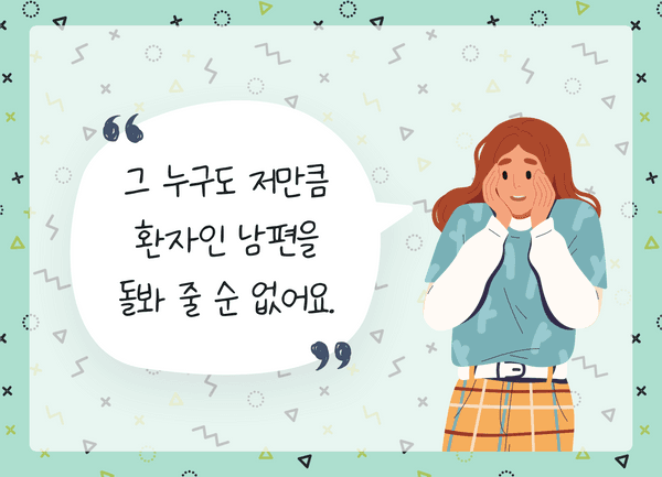 오랜 시간 보호자 생활을 지속해 온 경우, 보호자는 자신을 ‘환자를 돌보는 사람’으로만 규정짓기도 합니다. 하지만 나 혼자 할 수 있는 데에는 한계가 있음을 인정하고 다른 사람의 도움을 받게 된다면, 자신을 새롭게 정의할 수 있습니다. 비로소 진정한 동반자로 환자와 함께할 수 있게 되는 것입니다.