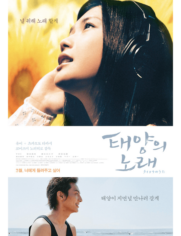 코이즈미 노리히로 감독의 2006년 작품 〈태양의 노래〉는 일본의 소설가 텐카와 아야의 소설을 바탕으로 합니다. 주인공 카오루는 색소성 건피증 환자로, 해가 진 저녁마다 아무도 없는 역 앞에서 노래를 부릅니다. 카오루는 언젠가부터 눈에 들어오게 된 코지에게 돌진하여 자신의 마음을 고백합니다. 코지는 당황하지만, 자신의 꿈을 포기하지 않는 순수한 카오루에게 빠지게 됩니다. 그러나 카오루는 몸이 점점 이상해지는 것을 느끼고 코지의 곁을 떠나기로 합니다. 국내에서는 2010년 뮤지컬로, 해외에서는 영화로 리메이크되었습니다.